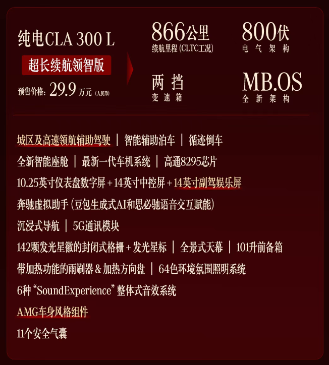 IT之家 9 月 28 日消息,在 2025 世界新能源汽车大会上,梅赛德斯-奔驰中国自动驾驶与车联网执行副总裁王忻表示,奔驰全新纯电 CLA 将于 10 月迎来正式上市。新车已于 9 月 25 日开启预售,包含两款车型,预售价区间 25.9-29.9 万元。