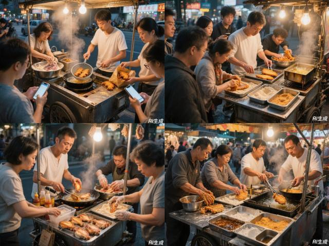 Prompt:“一个热闹的简陋小吃推车前,四位家人正在分工合作,摊主(黑色头发、白色上衣、身型较瘦)炸鸡排,妻子协助制作鸡排,母亲负责给鸡排裹粉,小舅子腌制鸡排,有很多客人边拿着手机边等待”