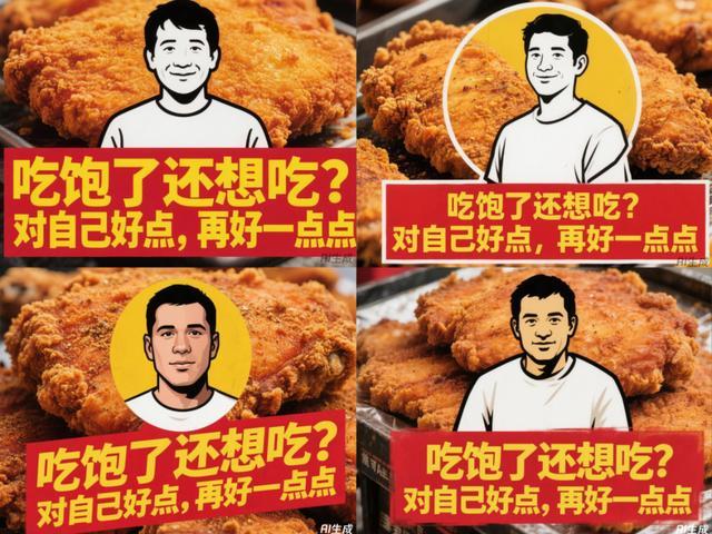 Prompt:“一个竖版简陋小吃推车的海报,背景是炸鸡排特写,中央是鸡排主理人头像(黑色头发、白色上衣、身型较瘦),底部大字写着‘吃饱了还想吃?对自己好点,再好一点点’,整体风格红黄为主,像街头招贴”