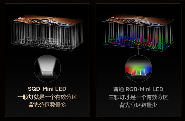 RGB-Mini LED电视的发光芯片实际是由三色发光芯片组成,也就是三颗灯放成一组才能发白光,而SQD-Mini LED电视一颗发光芯片就能发白光。因此同样成本下,同样1颗灯SQD-Mini LED电视的背光分区数量可以达到同尺寸RGBMini LED电视的3倍。