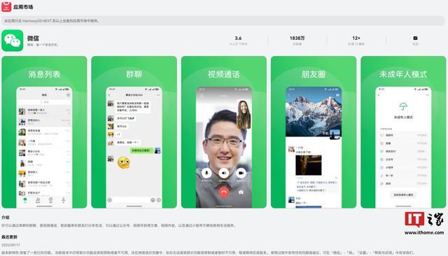 IT之家 9 月 28 日消息,微信鸿蒙版 App 今日在华为应用市场(App Gallery)开启 1.0.11.34(1051426)版本尝鲜升级(无需收到短信通知后点击链接跳转安装,可能量少,未来得及安装需等待官方“补货”),测试时间为 2025/9/28-2025/10/27。