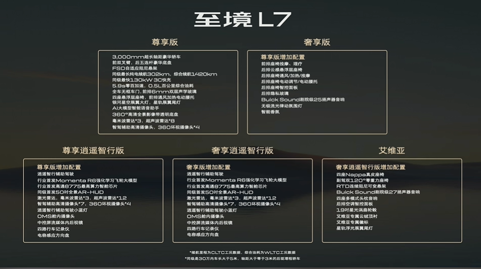 尊享版、奢享版、尊享逍遥智行版、奢享逍遥智行版,还有一个特别推出的技术集大成者——艾维亚版本。