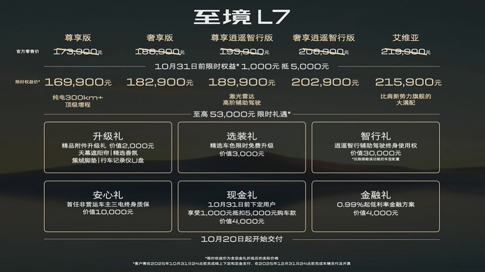 最后来看价格,至境L7一共推出了五个版本,分别是: