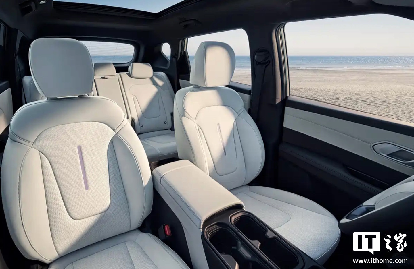 该车内饰采用大尺寸中控屏 + 副驾娱乐屏组成的 27 英寸一体式连屏设计,中控台取消了传统物理按键,同时标配 HUD 系统,支持普通 / 极简 / 地图三种显像模式自由切换。车辆匹配三辐式多功能方向盘,方向盘后侧设计了两个换挡拨片,拨动拨片即可切换 4 档动能回收模式,长按拨片还能激活单踏板模式与 AUTO 自动回收模式。