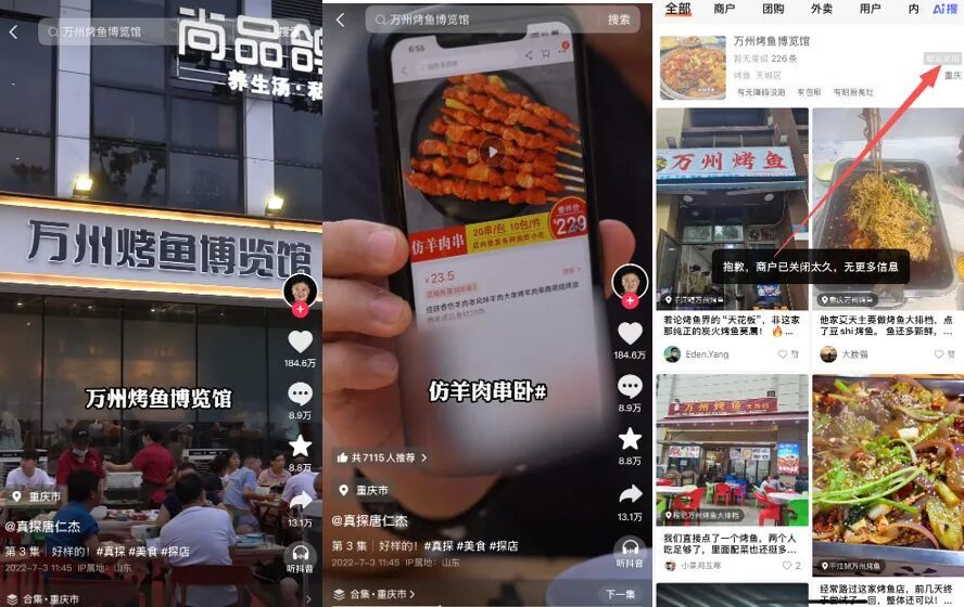 较为知名的是博主“真探唐仁杰”探店万州烤鱼博览馆事件,彼时该博主在抖音、快手、B站等平台粉丝量已超1000万。在2022年7月发布的视频中,该博主探店重庆万州烤鱼博览馆,发现商家菜品质量不佳,烤羊肉串的竹签上写着供应商品牌名称,可以查到是“仿羊肉串”,豆腐丸子已经腐败变酸,数量也不对。