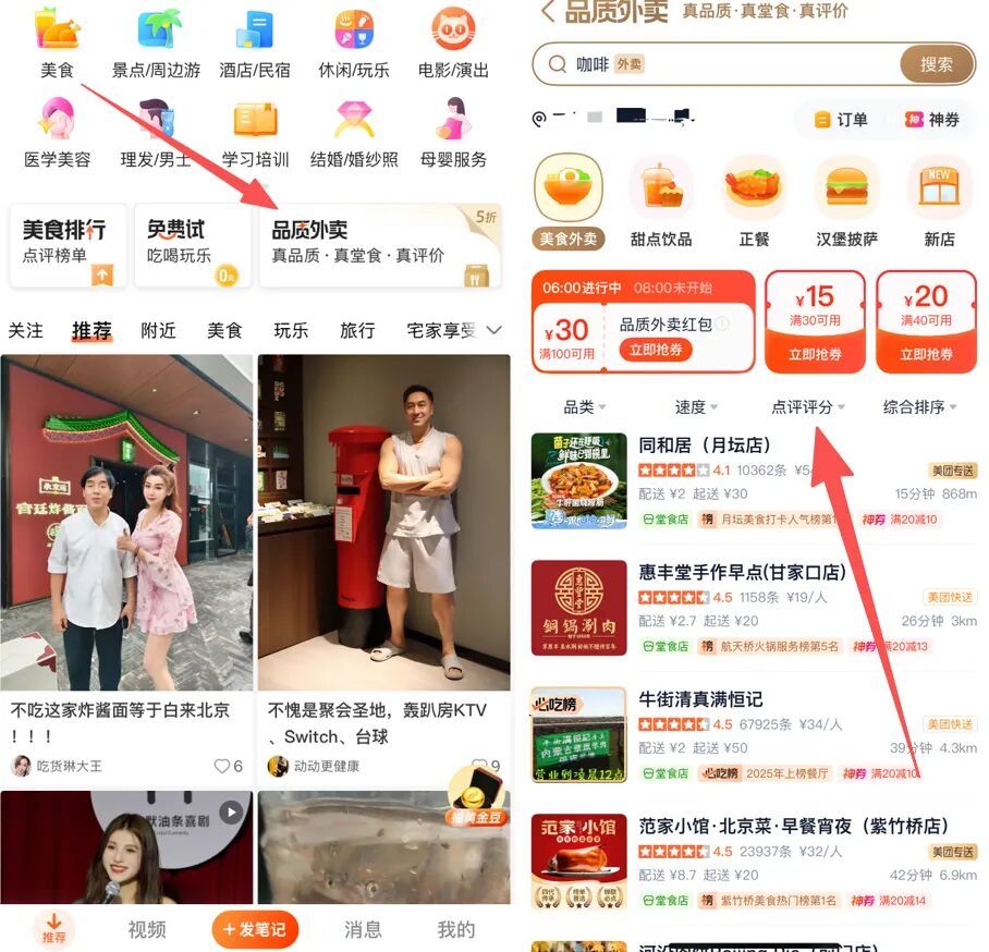 品质外卖界面与大众点评原先内嵌的外卖页面结构大体一致,两者均有搜索框、食物分类、排序等功能,只是前者多了一项“点评评分”——用户可以直接选择点评评分3.5星、4星或4.5星的堂食门店订购外卖。