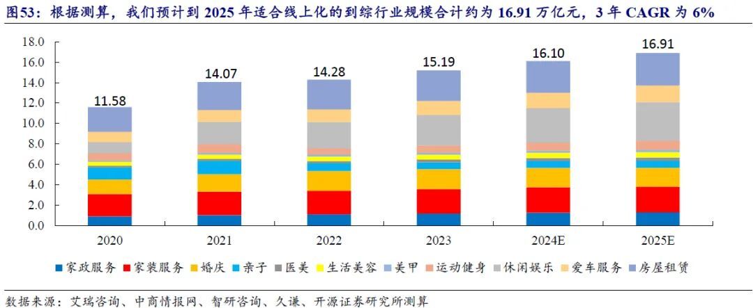按照开源证券2024年12月一份研报的测算,国内适合线上化的到店综合行业,国内适合线上化的到店综合行业,包括家政、家装、生活美容、美甲、休闲娱乐等,2023年市场规模约为15.2万亿元,线上化率仅2.1%,预计2025年将达16.9万亿元,这些行业有望借助互联网平台流量“重做一遍”。