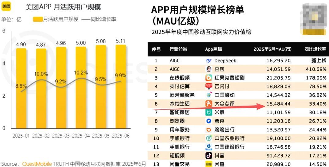 美团与大众点评的加总用户量亦不容小觑。据调研机构QuestMobile数据,2025年6月,美团月活用户规模即MAU为5.11亿,大众点评MAU为1.55亿。