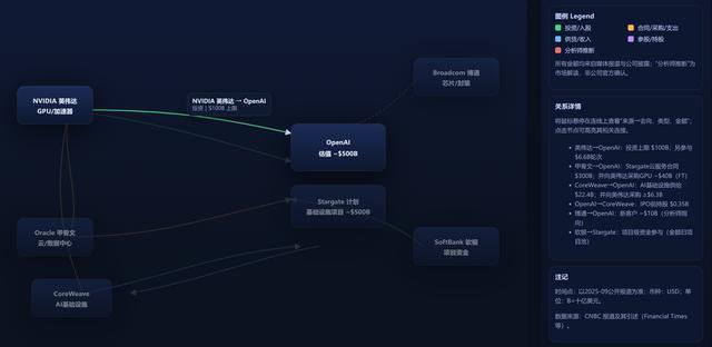 9月,英伟达还披露收到CoreWeave一份价值约63亿美元(约合人民币448亿元)的GPU订单,进一步强化了产业链内部的互相绑定(如图,资金在几个公司内部循环流转)。分析人士指出,这种这种环环相扣的资金与订单流动,形成了“自我循环”式的资金流动,也带来了风险隐忧。
