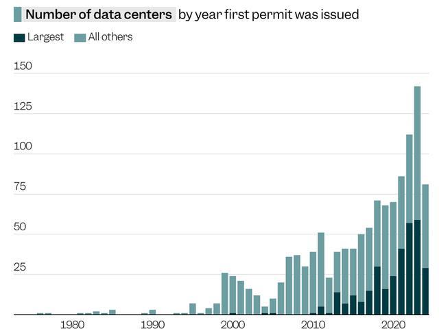 调查结果令人震惊,截至2024年,美国已建成或获批建设的大型数据中心多达1240座,数量在过去近15年间几乎增长了300%。