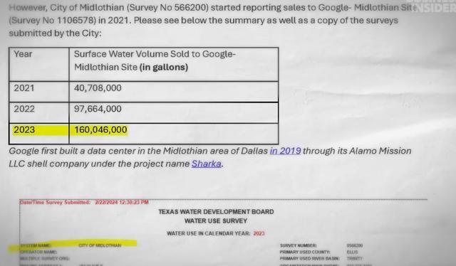数据中心的用水量,同样被视为商业机密。不过,Business Insider设法获取了50多份相关数据。例如,谷歌在德州米德洛锡安的数据中心2023年耗水6.1亿升;科罗拉多州的Kindred数据中心同年耗水3.2亿升。