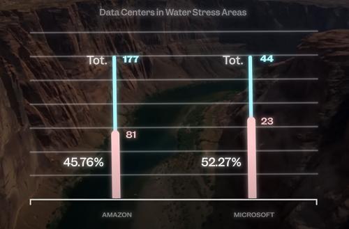 调查发现,43%的大型数据中心位于高度或极度缺水地区,而且,这些数据中心使用的就是饮用水。亚马逊45.76%的数据中心分布在高度缺水区域,而微软的这一比例达到52.27%。
