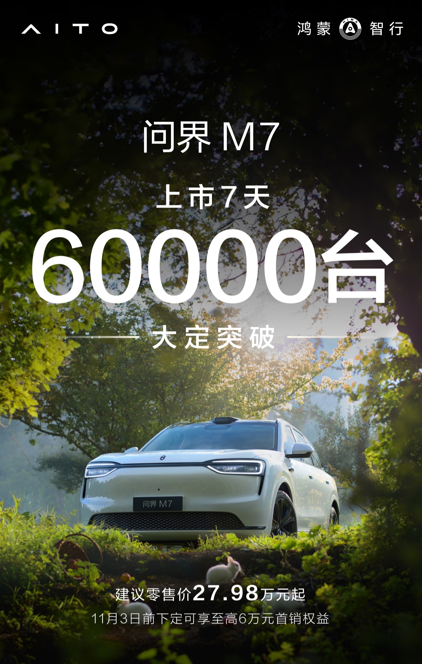 IT之家 9 月 30 日消息,鸿蒙智行今天午间发布数据宣布,全新问界 M7 上市 7 天大定突破 6 万台。