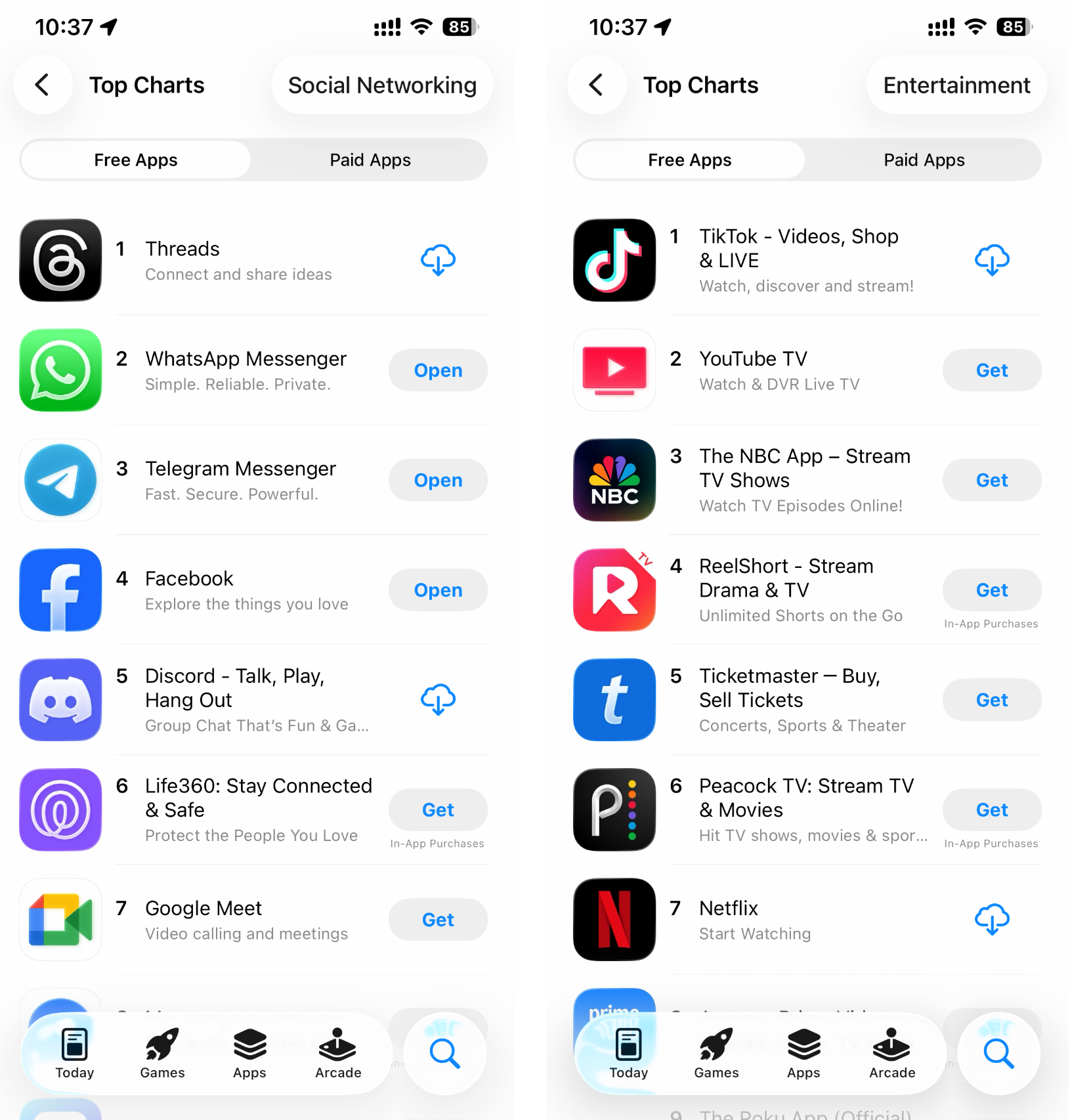 ▲ 社交榜和娱乐榜第一名分别是 Meta 的 Thread 和 TikTok