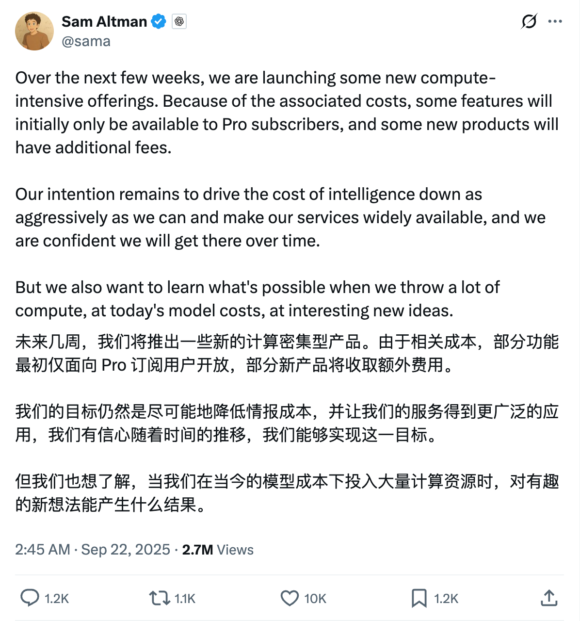 奥特曼曾经发 X 说,未来几周,OpenAI 将推出一些新的计算密集型产品,且最初只会向 Pro 用户开放。而需要大量算力的,不正是视频生成吗?目前 Sora 也仅面向 Plus 和 Pro 用户,传闻已久的 Sora 2 真的要发布了。
