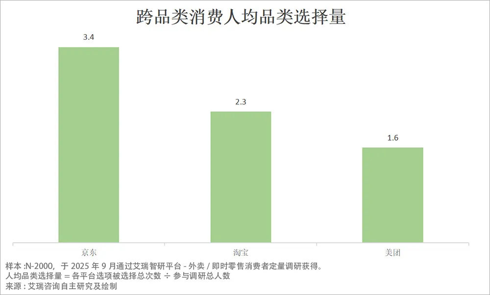 图源:外卖在京东、淘宝、美团协同广度——跨品类消费人均品类选择量 艾瑞