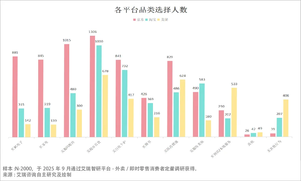 图源:外卖在京东、淘宝、美团协同深度——各平台品类选择人数 艾瑞