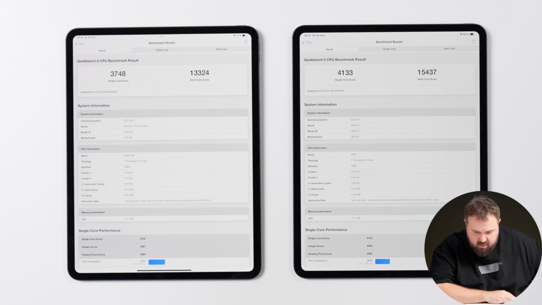▲ 左:M4 iPad Pro,右:M5 iPad Pro,图源:YouTube@Wylsacom