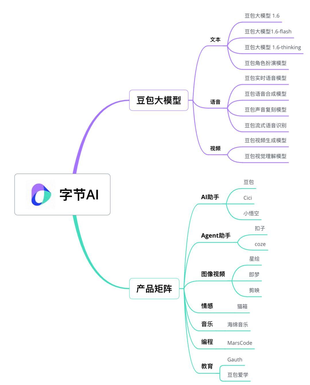 在产品层面,从助手、教育、编程、音乐、图像、情感到办公,字节AI的产品矩阵几乎覆盖了用户日常与创作的各种高频场景。产品种类丰富,每个细分领域都有对应产品,透露出其多产品并行、多点开花的战术。