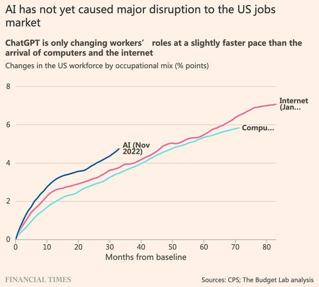 ChatGPT的大规模普及尚未对美国就业市场造成重大颠覆,这与众多企业高管和科技公司负责人声称人工智能已在颠覆劳动力市场的说法相矛盾。耶鲁大学预算实验室与布鲁金斯学会智库的经济学家研究发现,自2022年11月OpenAI推出热门聊天机器人以来,生成式AI对就业的影响并未比以往技术突破更加剧烈。