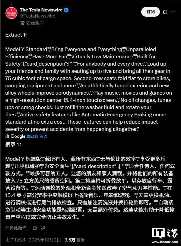 IT之家 10 月 2 日消息,备受期待的特斯拉 Model Y 低价版本可能很快推出,该公司官网源代码中已悄然出现全新“Model Y 标准款”(Model Y Standard)的相关信息,为这款流传数月的低价车型提供了迄今为止最明确的线索。