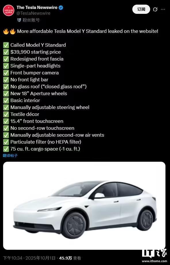 代码显示,Model Y 标准款定价为 39,990 美元(IT之家注:现汇率约合 28.5 万元人民币),是目前特斯拉售价最低的 SUV 车型,定位低于长续航版和高性能版,主要面向希望加入特斯拉生态、但对豪华附加配置需求较低的消费者。