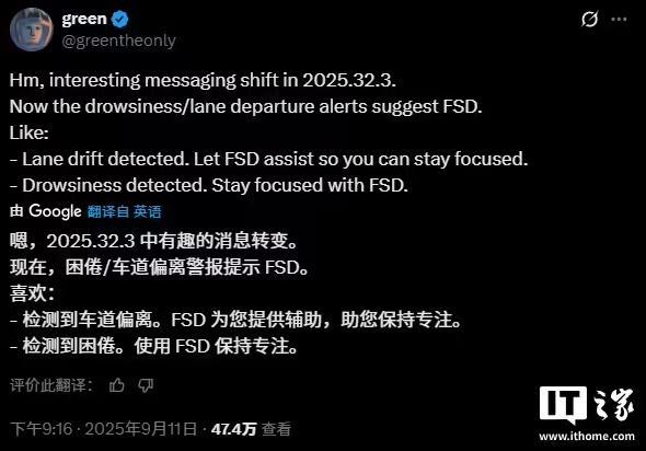 对特斯拉而言,在当前节点公然向疲劳驾驶者推荐 FSD,尤其不合时宜。今年 8 月,该公司被判支付 3.29 亿美元(IT之家注:现汇率约合 23.43 亿元人民币)赔偿金,原因是一辆搭载旧版“自动辅助驾驶”(Autopilot)软件的特斯拉汽车,以每小时 60 英里的速度冲过十字路口,导致一名年轻女性死亡。