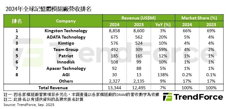 IT之家 10 月 2 日消息,TrendForce 集邦咨询在 9 月 30 日的报告中指出,Kingston 金士顿在 2024 年以 88.58 亿美元的营收和 66% 的市场占比再度蝉联全球第一大 DRAM 内存模组厂的桂冠。