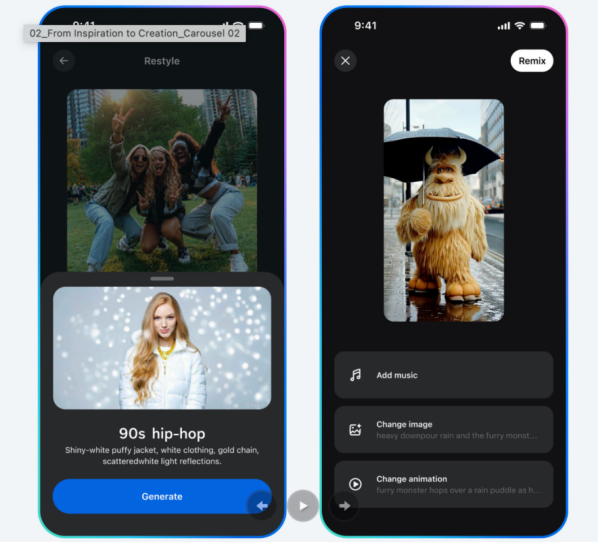 在Meta的官方博文中写道:“Vibes 旨在让您更轻松地寻找创意灵感,并体验 Meta AI 的媒体工具。浏览时,您会看到来自创作者和社区的一系列 AI 生成的视频。随着时间的推移,这些动态会变得更加个性化,如果您喜欢某个内容,可以创建自己的视频,重新合成,并与好友和粉丝分享。”