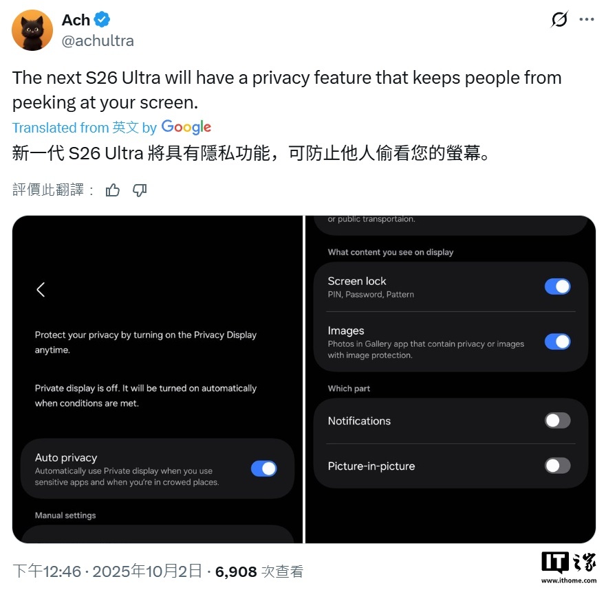 IT之家 10 月 2 日消息消息人士 Ach 今天在 X 平台透露,三星 Galaxy S26 Ultra 手机将拥有全新隐私防护功能可在公众场合中自动开启