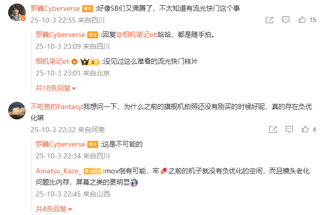 有用户称“没见过这么难看的流光快门样片”,罗巍表示“都是随手拍”,结合样张来看,此举暗示新机在夜景防抖能力上有所突破。值得一提的是,罗巍还回应了旗舰机拍照还没有刚买的时候好,是否存在负优化的问题:“这是不可能的”。