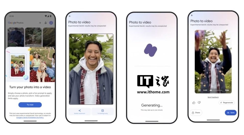 作为比较,目前谷歌相册 App 中相关功能只有两个选项,分别是“添加轻微动作”(为人物添加轻微的动作)和“手气不错”(IT之家注:随机生成视频),用户不太能自己掌控内容生成方向,很多时候只能一遍遍随缘点击“手气不错”来慢慢碰运气。