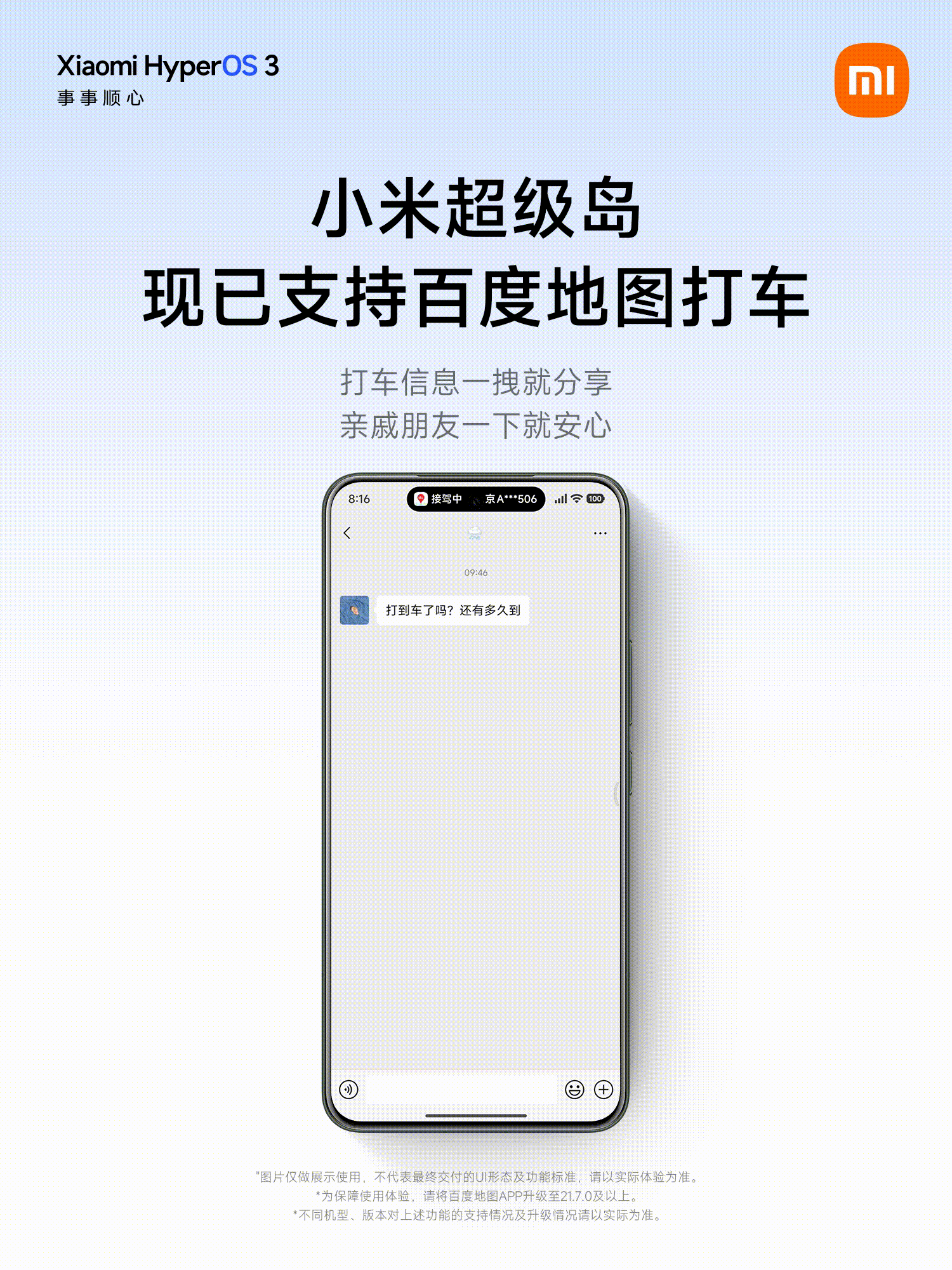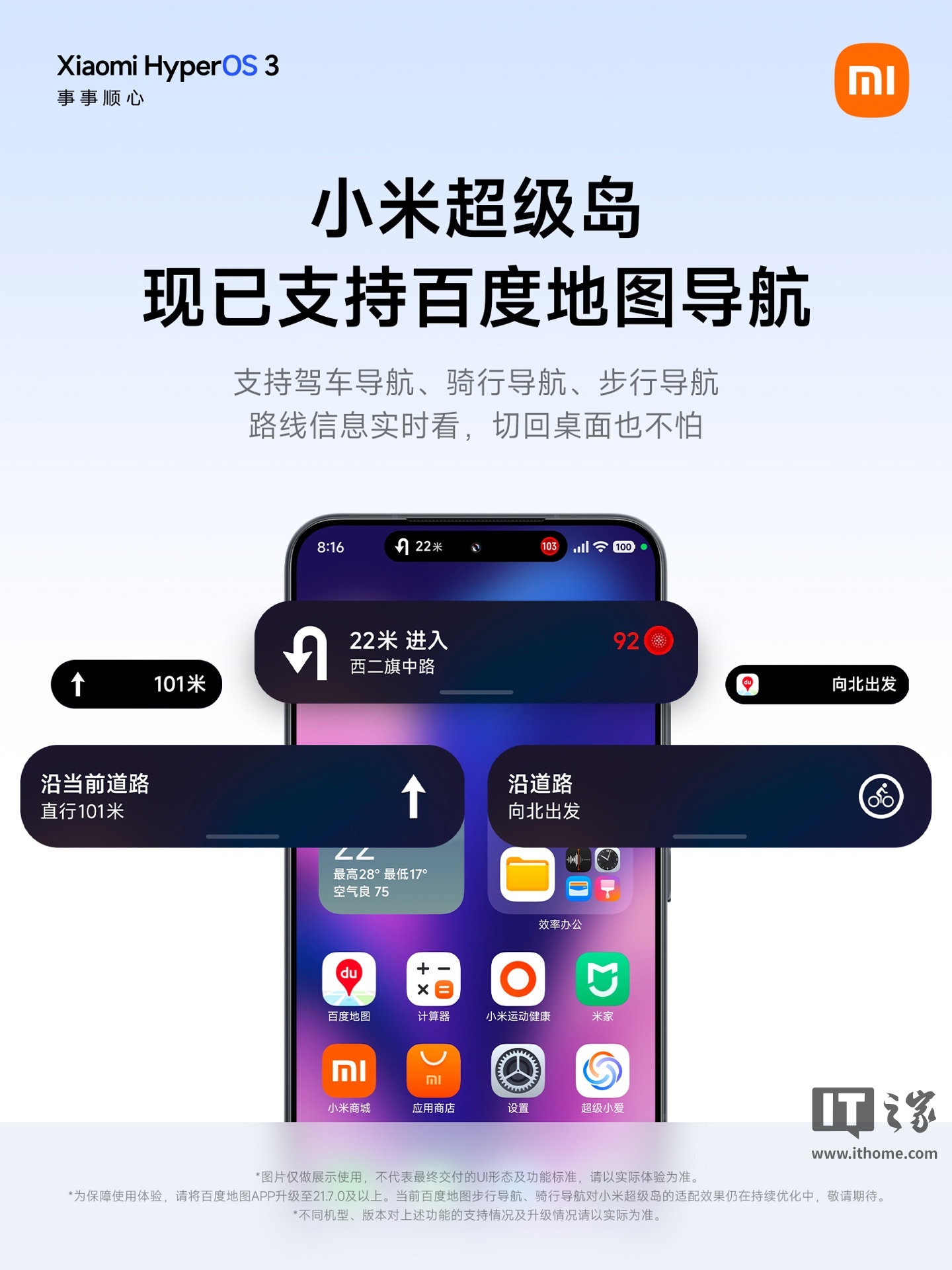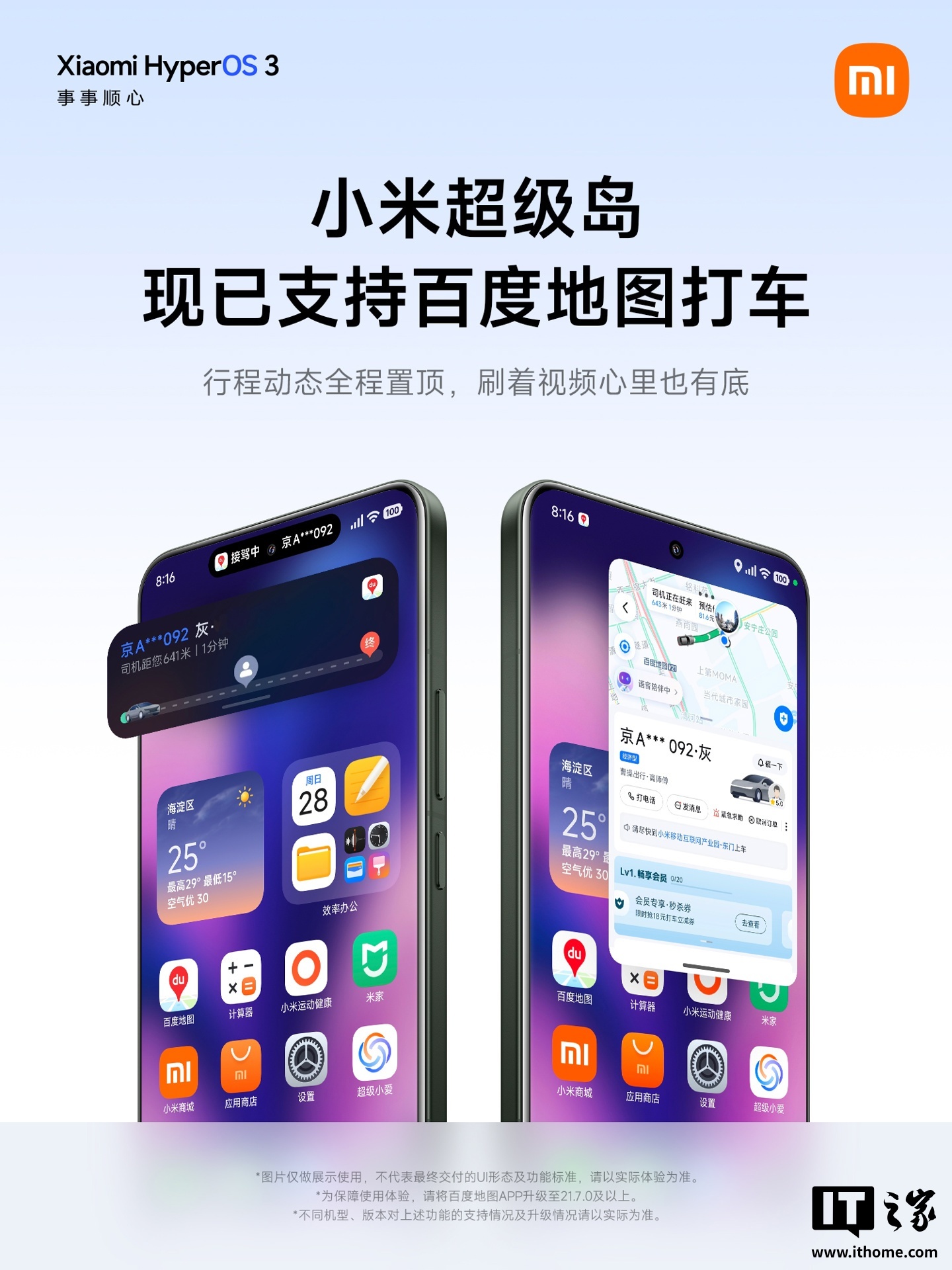 IT之家 10 月 4 日消息,小米澎湃 OS 官方今日宣布,小米超级岛已支持百度地图,可实现实时展示地图导航信息,适配驾车认路、骑行探索、步行逛街等场景;支持百度地图打车,可实现打车进度全程跟随、随手拖拽分享等特性。