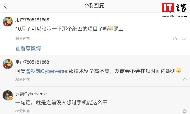 IT之家注意到,有用户提问“10 月了可以暗示一下那个绝密的项目了吗?”罗巍称“一句话,就是之前没人想过手机能这么干。”