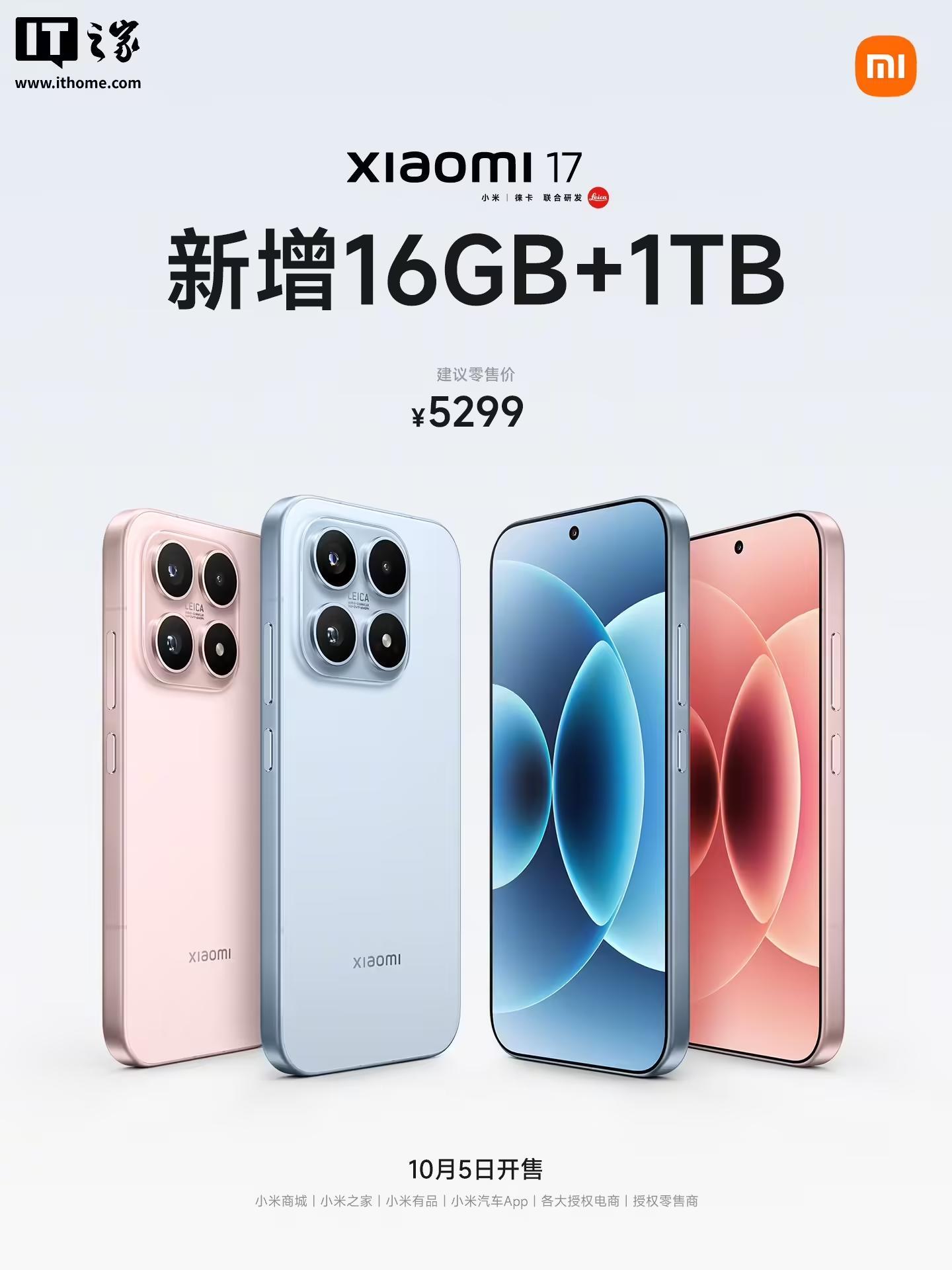 IT之家 10 月 5 日消息,小米 17 标准版手机 16GB+1TB 今日 10 点开售,搭载第五代骁龙 8 至尊版处理器、7000mAh 电池,售价 5299 元。