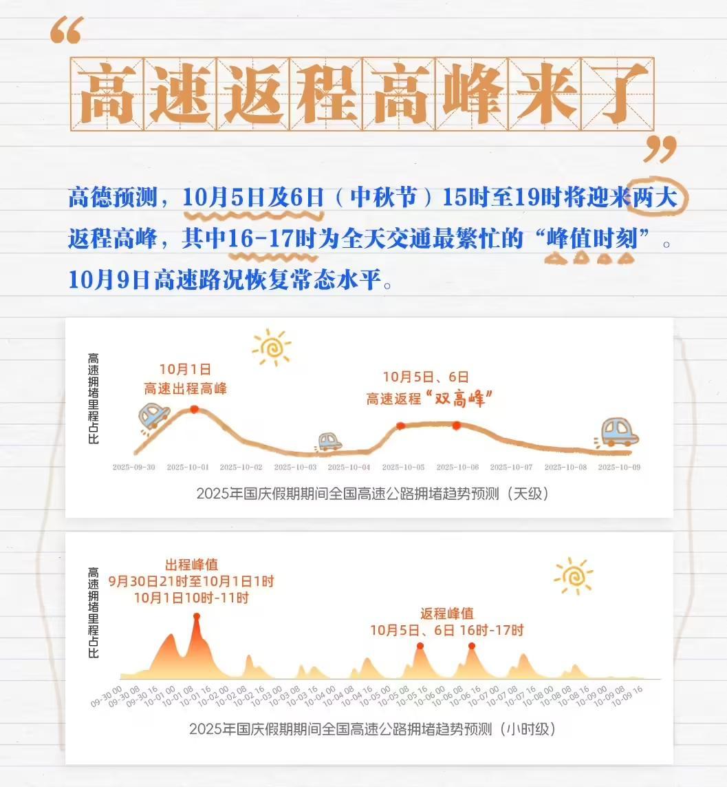 IT之家 10 月 5 日消息,高德地图预测显示,10 月 5 日及 6 日(中秋节)15 时至 19 时将迎来两大返程高峰,其中 16-17 时为全天交通最繁忙的“峰值时刻”。高德建议返程用户提前规划时间与路线,尽量上午出发,避免与下午高峰时段重叠。