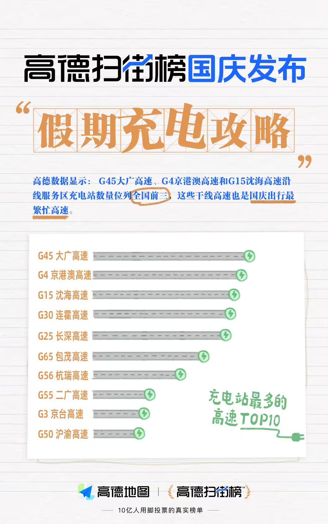 高德地图在线全国公共充电站总量已达到 30 多万座。全国服务区内充电站数量 TOP5 的省份是:广东、河南、浙江、河北、安徽。G45 大广高速、G4 京港澳高速和 G15 沈海高速沿线服务区充电站数量位列全国前三,这些干线高速也是国庆出行最繁忙高速。