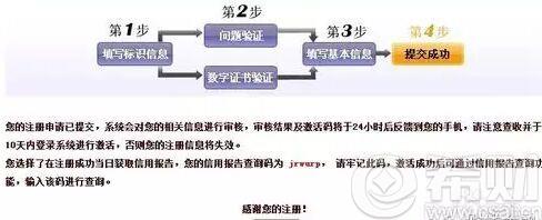 注:提交注册申请后,暂时还不能查询征信记录,因为平台需要进行身份验证、审核,系统会在24小时后,往刚刚你填写的那个手机号上发送审核结果,信息中包含激活码。