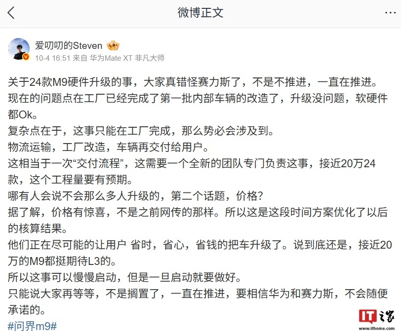 IT之家 10 月 5 日消息,博主 @爱叨叨的Steven 昨日发文透露,关于 24 款 M9 硬件升级的事,赛力斯一直在推进,现在工厂已经完成了第一批内部车辆的改造,升级没问题、软硬件都 OK。但复杂点在于只能在工厂完成,会涉及到物流运输、工厂改造、车辆再交付给用户等流程。