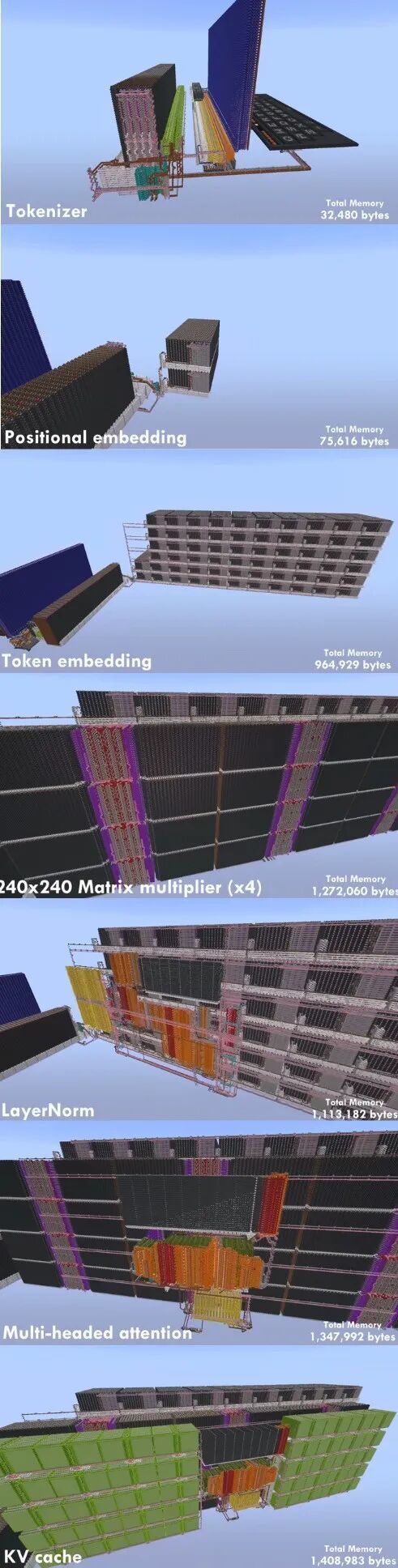 而且手搓这么一个GPT竟然没用指令集,完全是用红石电路(0/1)和存储单元手搓出来的。