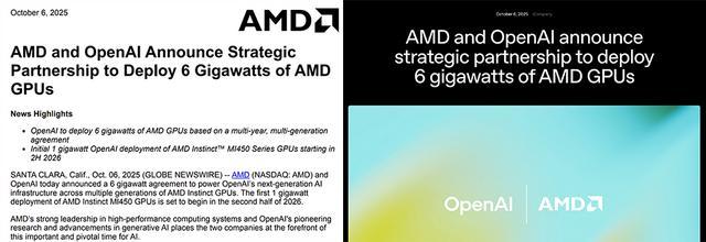 智东西10月6日报道,刚刚,OpenAI和AMD宣布合作,OpenAI将根据多年、多代协议部署60亿瓦AMD GPU,并将于2026年下半年开始部署AMD InstinctMI450系列GPU,初始部署功率为10亿瓦。