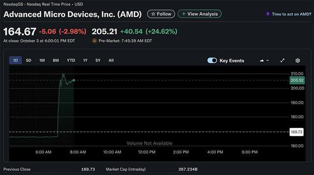 美东时间周一早上盘前交易中,AMD股价飙升超过35%,英伟达、博通股价均下跌超过1%。