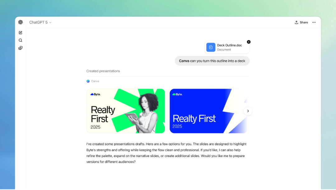 Canva (设计平台):在一个为宠物狗遛弯业务进行头脑风暴的对话中,用户可以直接呼叫 Canva,并用自然语言下达指令,例如“Canva,用这个名字为我制作一个作品集,我希望它色彩丰富、异想天开、明亮,并使用无衬线字体”。Canva 应用会直接在对话中生成设计选项。用户还可以进一步迭代,比如将一张海报转化为一个用于种子轮融资的完整 Pitch Deck (简报)。整个创意流程在同一个对话窗口中无缝完成