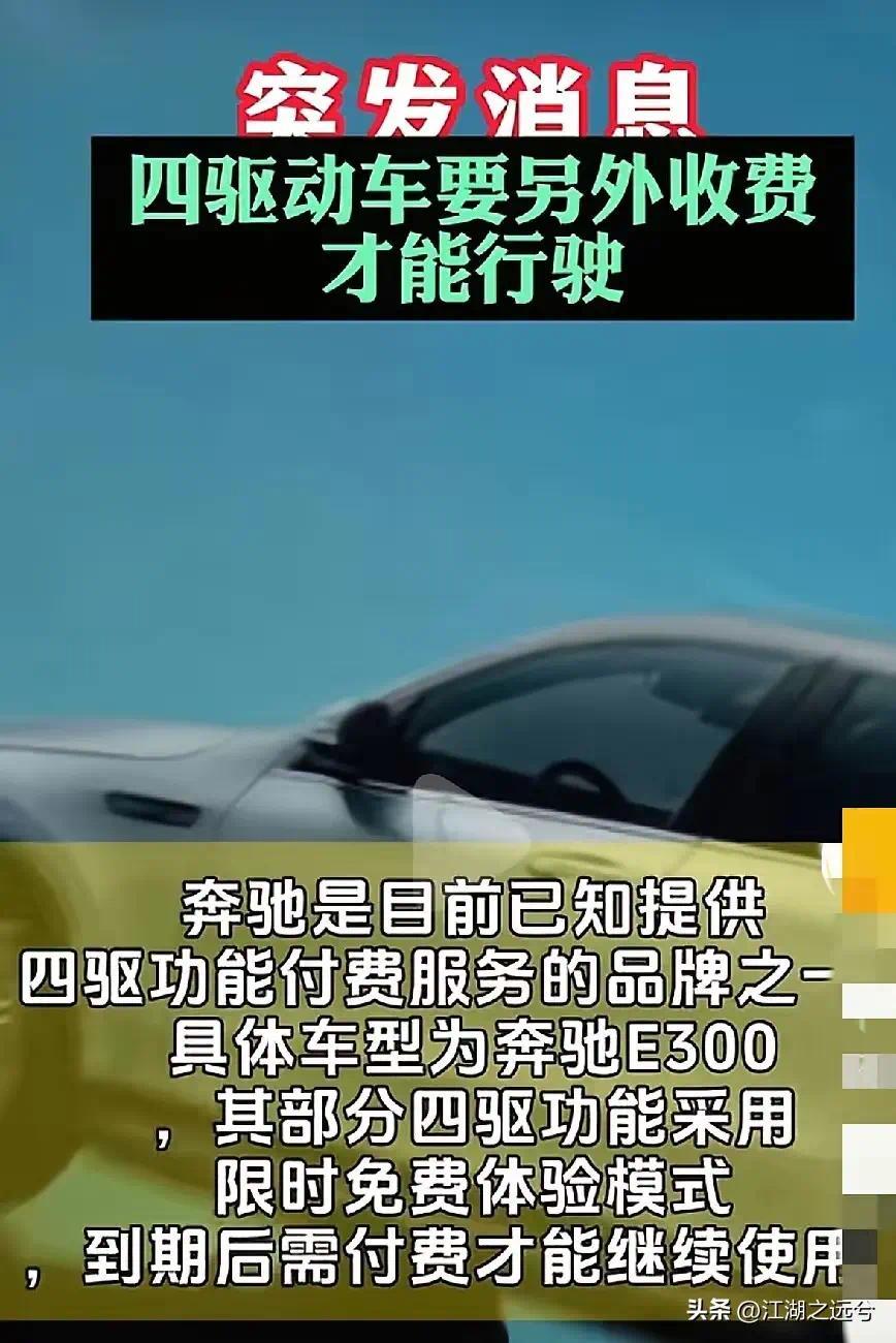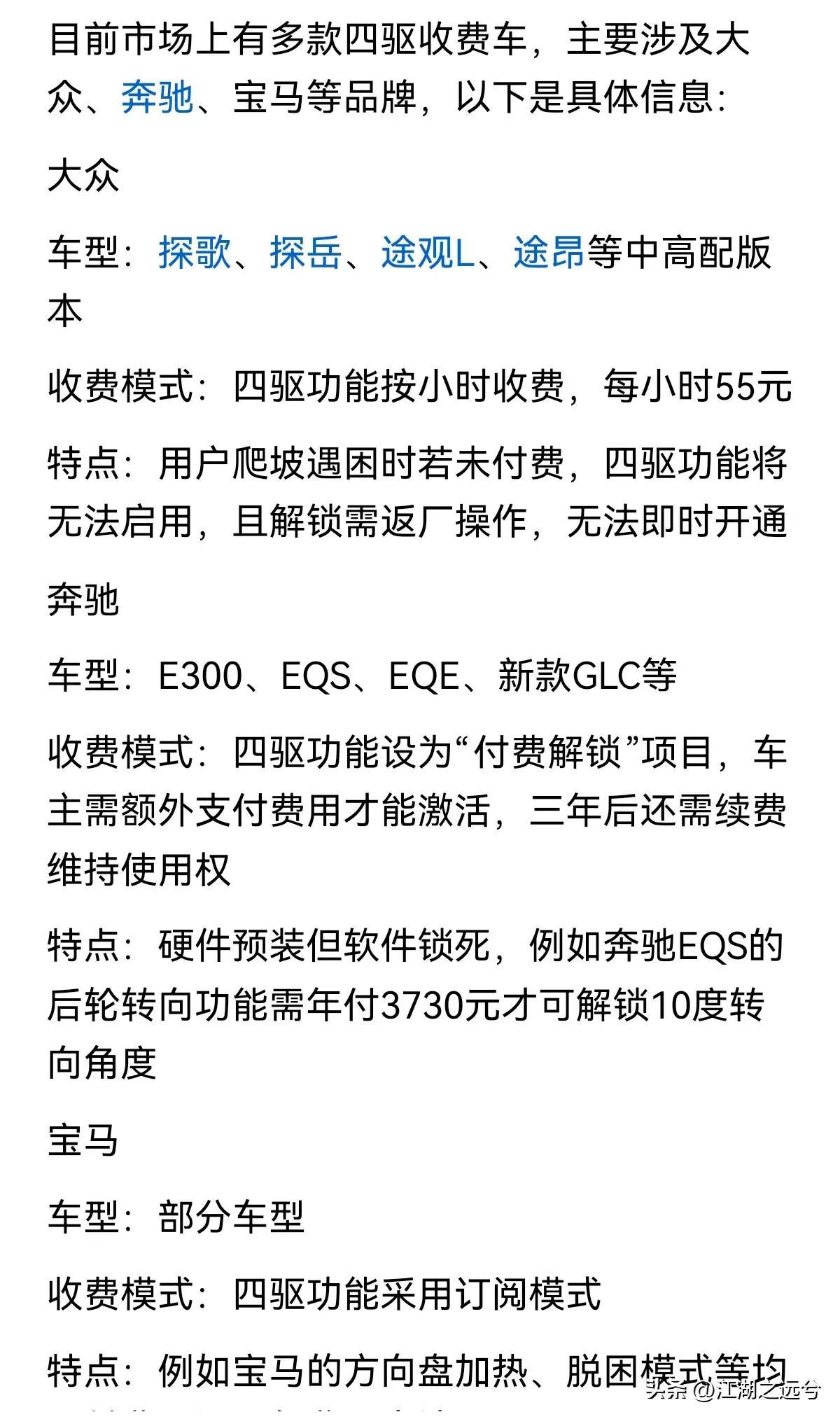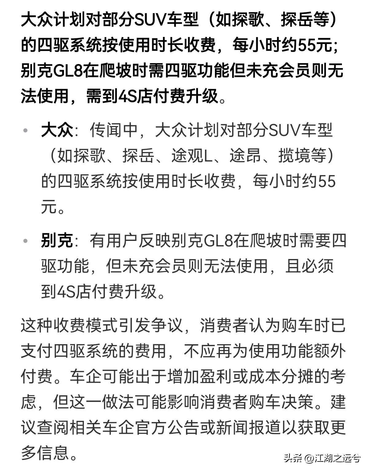 目前有相当一部分车型对用户已购汽车的一些功能,比如四驱,需开通会员或收费后才能使用。大众计划对部分SUV车型(如探歌、探岳等)的四驱系统按使用时长收费,每小时约55元;别克GL8在爬坡时需四驱功能但未充会员则无法使用,需到4S店付费升级。等等,还有好多次车型是这样。
