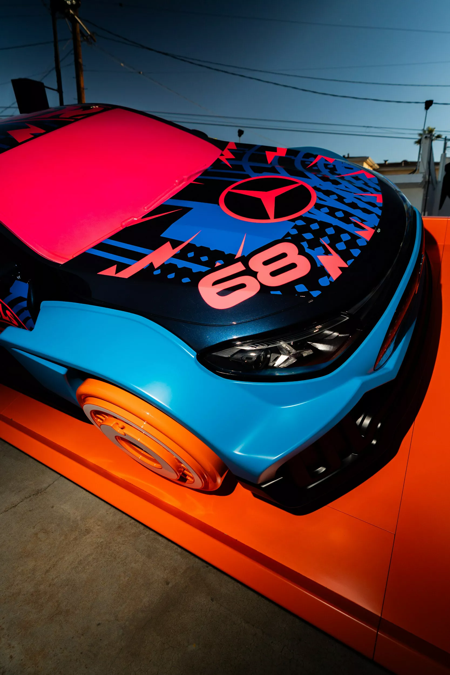 梅赛德斯方面表示,车身涂装借鉴了风火轮的经典美学,混合了亮橙色、粉色与蓝色调,而超大尺寸的火焰图案则营造出一种让人联想到 80 年代流行文化的复古未来主义外观。