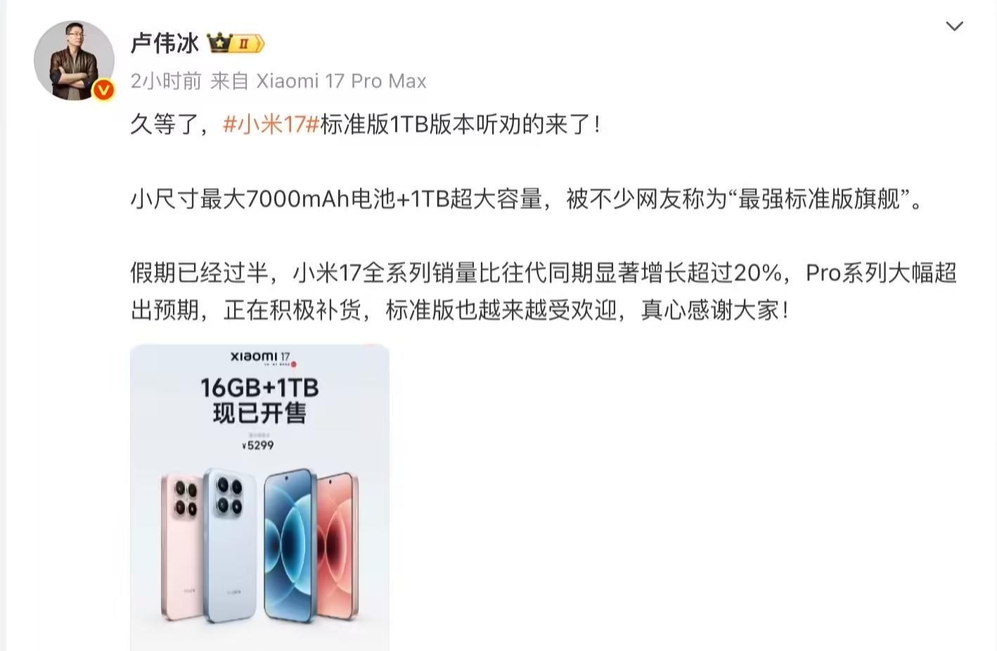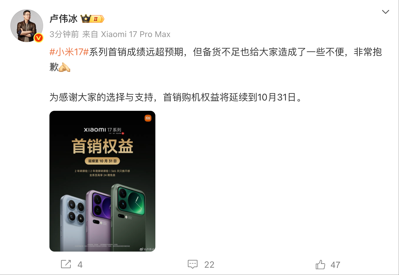 卢伟冰:小米17系列首销成绩远超预期 购机权益将延续到10月31日 凤凰网科技讯 10月7日,小米集团合伙人卢伟冰发文称,小米17系列首销成绩远超预期,但备货不足也给大家造成了一些不便,非常抱歉。为感谢大家的选择与支持,首销购机权益将延续到10月31日。 10月5日,卢伟冰发文披露,小米17全系列销量比往代同期显著增长超过20%,Pro系列大幅超出预期,正在积极补货,标准版也越来越受欢迎。 据悉,小米17标准版16GB+1TB现已开售,搭载第五代骁龙8至尊版处理器、7000mAh电池,售价5299元。 Published by 风君子 独自遨游何稽首 揭天掀地慰生平 View all posts by 风君子