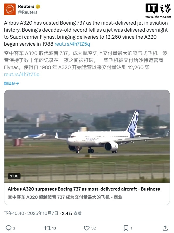 据英国航空数据分析机构 Cirium 统计,空客 A320 系列机型交付量至此首度超越波音 737 系列,成为航空史上交付量最多的喷气式客机。