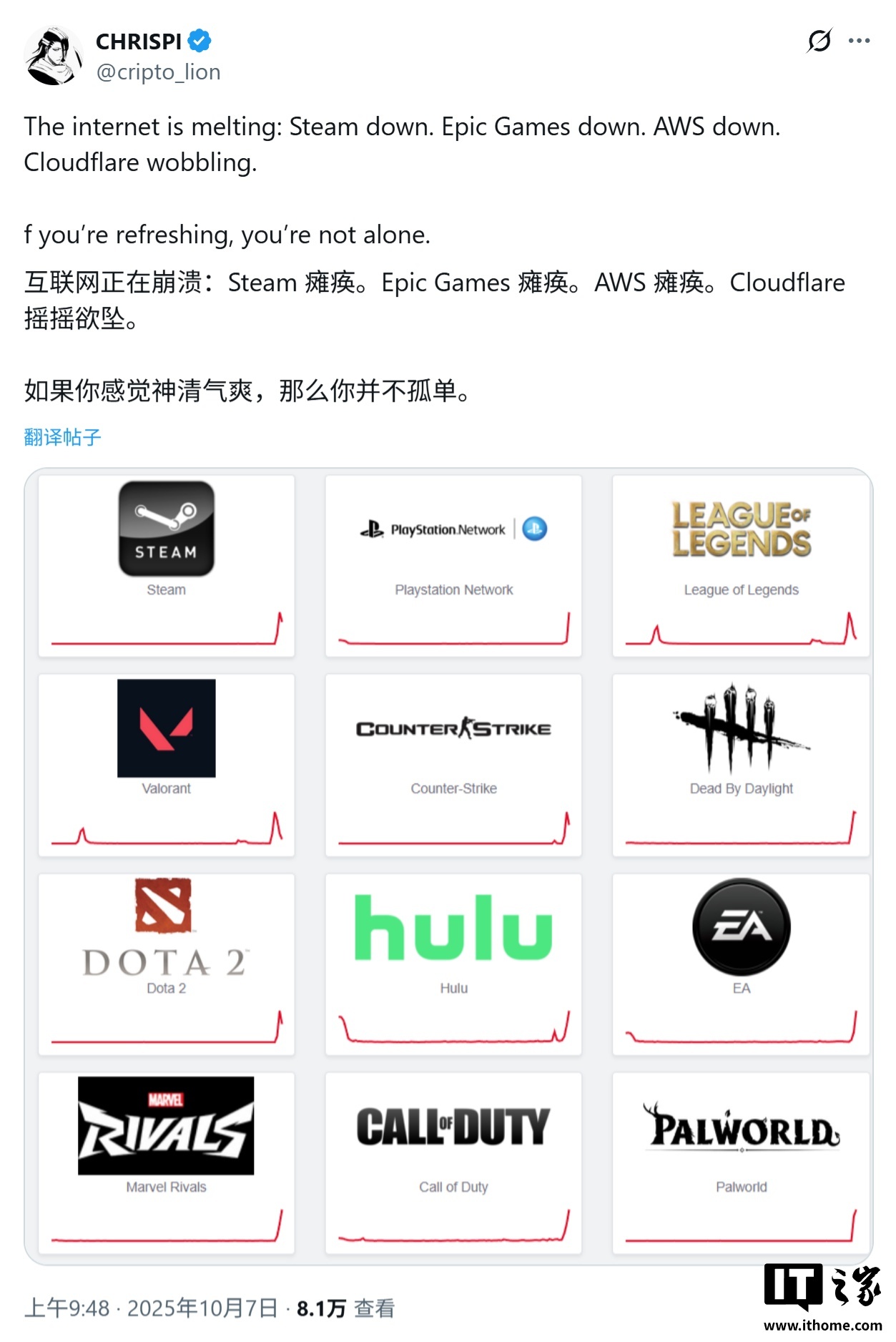 IT之家 10 月 8 日消息,游戏媒体 thegamepost 昨日(10 月 7 日)发布博文,报道称游戏平台 Steam 遭遇大规模服务中断,影响范围波及全球,无数玩家报告无法访问商店、社区页面及登录服务。