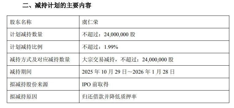 根据公告安排,本次减持将在公告披露之日起15个交易日后启动,具体时间窗口为2025年10月29日至2026年1月28日,交易方式限定为大宗交易。对于减持目的,公告明确为“归还借款并降低质押率”,这与虞仁荣此前多次通过股权质押融资并以偿还借款为资金用途的操作逻辑一致。