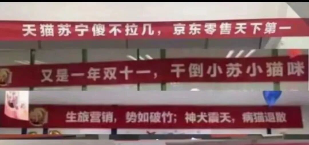 其实挂横幅并不是京东一家的文化,在中国的传统文化里,这属于很常见的行为。条幅越是醒目和朗朗上口,越能鼓舞斗气。